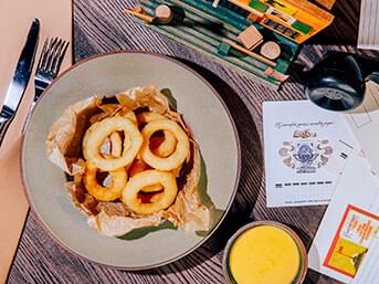 АССОРТИ ИЗ ЧЕСНОНЫХ ГРЕНОК, СТРИПСОВ, ЛУКОВЫХ КОЛЕЦ И КОЛЕЦ КАЛЬМАРА, 2 СОУСА